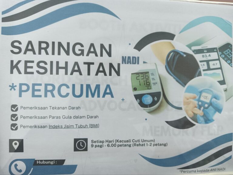 Tarikh : Januari 2026Masa : 9.00 AM – 6.00 PMTempat : NADI Bagan Nakhoda OmarKaedah Penyampaian : OfflineBilangan Peserta : 3 Orang Objektif Aktiviti Secara keseluruhannya, Program Saringan Kesihatan Percuma Bulan Januari 2026 telah berjalan dengan lancar dan mencapai objektif yang ditetapkan.
