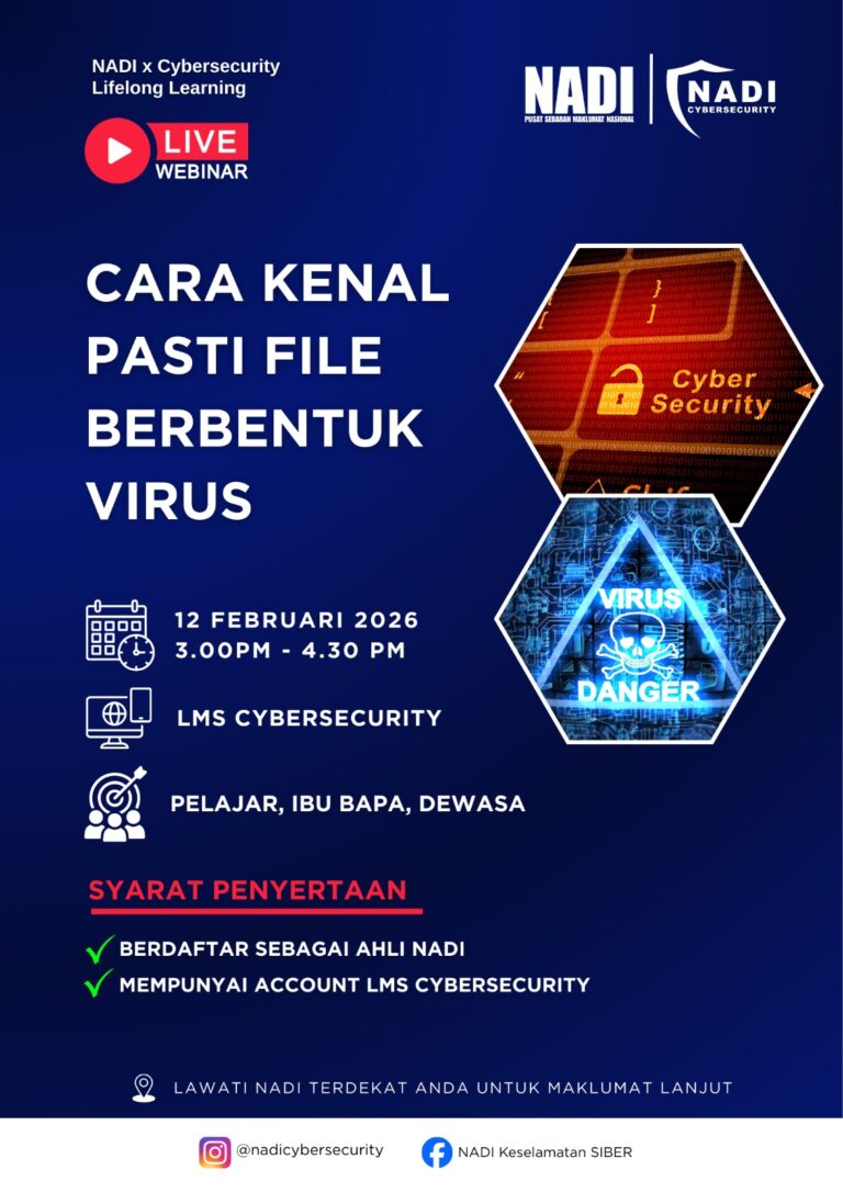 Tarikh : 12 Februari 2026Masa : 3.00 Petang – 4.30 PetangTempat : NADI Bagan Nakhoda OmarKaedah Penyampaian : Secara atas talianBilangan Peserta : 1 orang Objektif: Program Cybersecurity: Cara Mengenal Pasti Fail Berbentuk Virus telah diadakan bagi memberi pendedahan kepada peserta tentang ancaman keselamatan siber […]