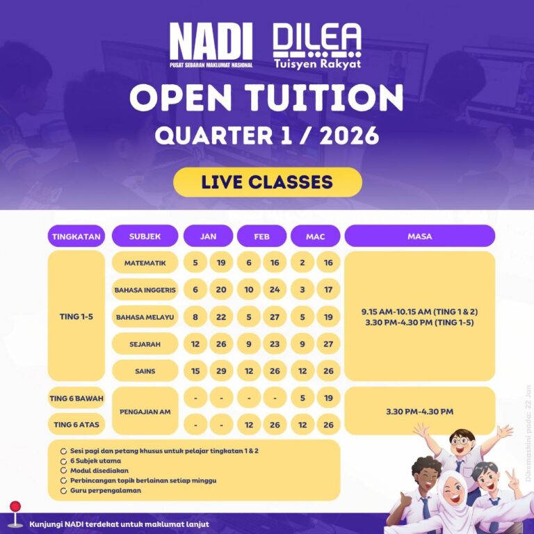 Tarikh : 24 Februari 2026Masa : 2.45 Petang – 3.45 PetangTempat : NADI Bagan Nakhoda OmarKaedah Penyampaian : Atas TalianBilangan Peserta : 2 orang Objektif Aktiviti Sesi Open Tuition ini berjaya meningkatkan minat dan kemahiran peserta dalam penggunaan Bahasa Inggeris. Pendekatan interaktif telah menggalakkan penglibatan […]