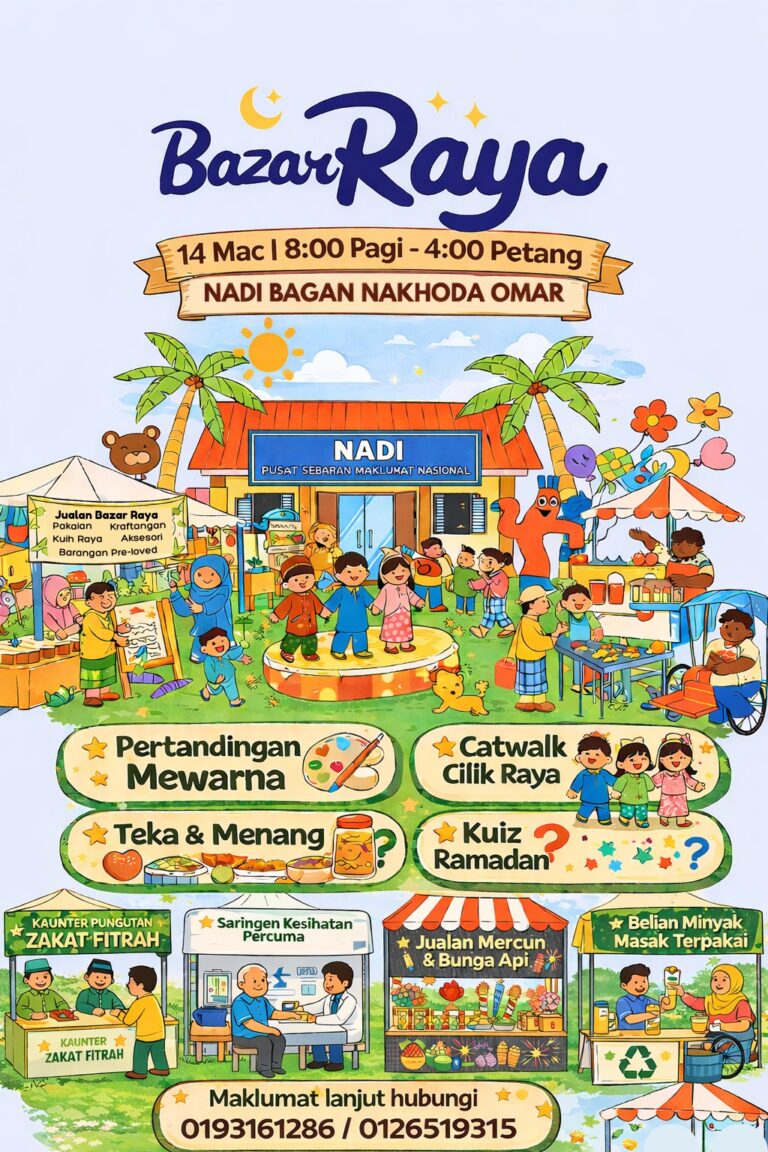 Tarikh : 14 Mac 2026Masa : 8.30 AM – 4.00 PMTempat : NADI Bagan Nakhoda OmarKaedah Penyampaian : BersemukaBilangan Peserta : 100 Orang Bazar Raya @ NADI merupakan satu program yang dianjurkan bagi memeriahkan suasana menjelang sambutan Hari Raya Aidilfitri di samping memberi peluang kepada […]